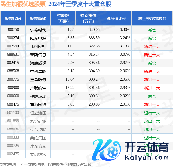 民生加银优选股票为股票型基金,笔据最新一期基金季报闪现,该基金财富建树:股票占净值比85.48%,无债券类财富,现款占净值比15.99%。基金十大重仓股如下: