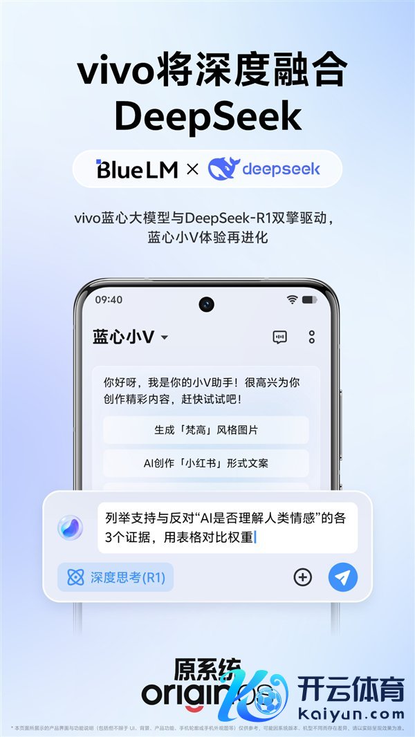 官方海报清晰,交融DeepSeek后,vivo OriginOS预装诓骗蓝心小V将因循深度念念考(R1)才能,可提供图片生成、AI文本创作、AI问答等功能。